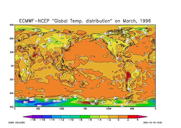 ここからさらなる解析を行う。ECMWFとNCEPの相違を見つけるためには、当然お互いの差をとることが重要である。そこで、まず全球分布した帯状風、温度の差を地表面付近でとる。