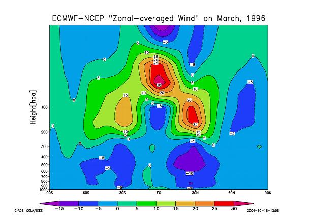 - 課題1 : 2種類の客観解析(ECMWF-ERA40とNCEP)のそれぞれについて、ある特定の月(例えば「1996年1月」のように任意に選択して良い)の帯状平均温度と帯状平均帯状風の計算それぞれの緯度-高度断面の作図を手始めに(これら2枚の図は必須)、各自が必要と判断する図を描く事により、2種類の客観解析間の相違について定量的な議論を行う。